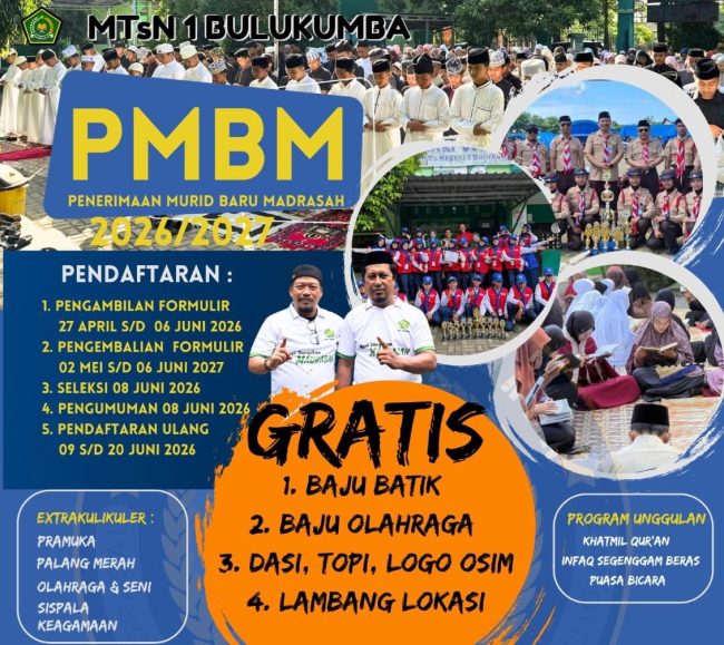 Untuk diketahui, PMBM (Pengambilan Formulir) di MTsN 1 Bulukumba akan di buka pada 27 April hingga 6 Juni 2026, Pengembalian Formulir 2 Mei hingga 6 Juni 2026, selekasi/tes masuk dan pengumuman hasil seleksi 8 Juni 2026, dan pendaftaran ulang pada 9 hingga 20 Juni 2026.