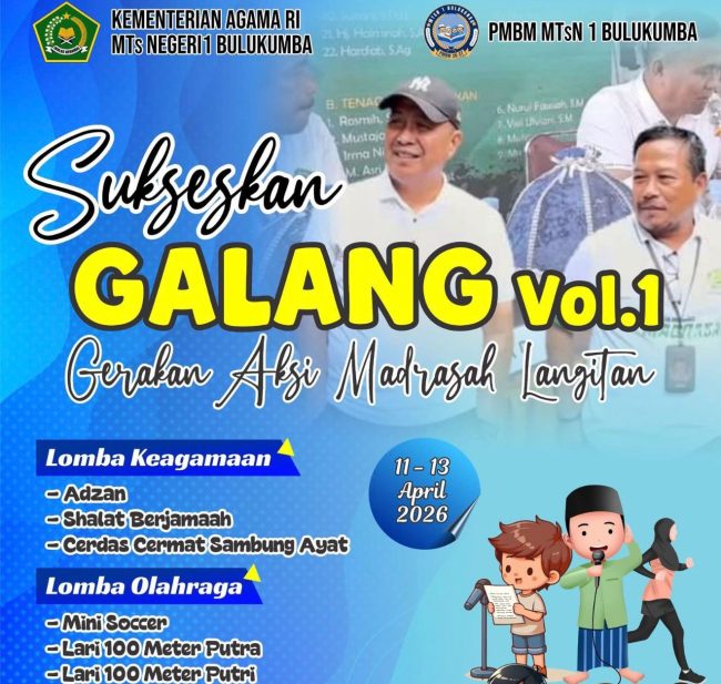 Bulukumbapos – Madrasah Tsanawiyah Negeri (MTsN) 1 Bulukumba akan menggelar Porseni yang diberi nama GALANG atau Gerakan Aksi Madrasah Langitan vol. 1, yang mengundang para murid di tingkat Sekolah Dasar/Madraasah Ibtidaiyah.